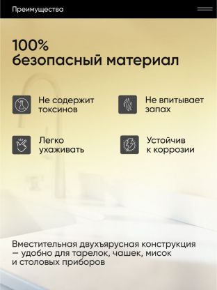 Благодаря продуманной конструкции, сушилка подходит для размещения тарелок, чашек и столовых приборов, обеспечивая их быстрое высыхание. Универсальность аксессуара делает его незаменимым помощником для поддержания чистоты и порядка после мытья посуды. Изделие легко очищается, не подвержено коррозии и деформации, что гарантирует долгий срок службы даже при интенсивном использовании.