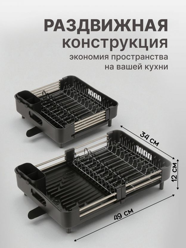 Сушилка для посуды из нержавеющей стали 49х34 см с раздвижной конструкцией и поддоном: компактное хранение, долговечность и стиль для любой кухни.
