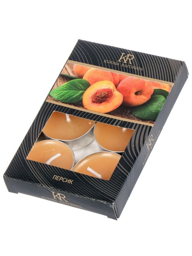 Ароматические чайные свечи Kukina Raffinata Персик — 6 шт. в коробке: свежий фруктовый аромат, компактный размер 1.2х3.8 см, горят до 3,5 часов, выгодно для подарка и уюта дома.