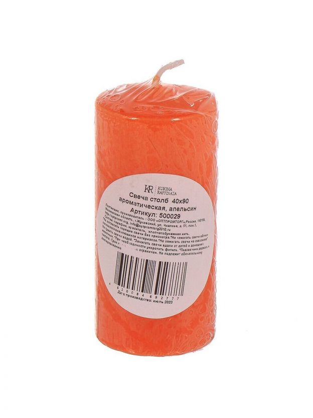Свеча изготовлена из парафина с хлопковым фитилём, высота — 9 см, диаметр — 4 см, форма — столбик, цвет — оранжевый.