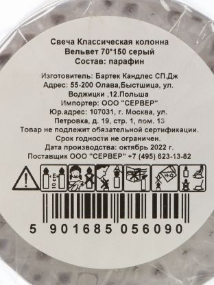 Свеча ароматизированная, 15х7 см, колонна, серая, Bartek Candles, Вельвет, классическая