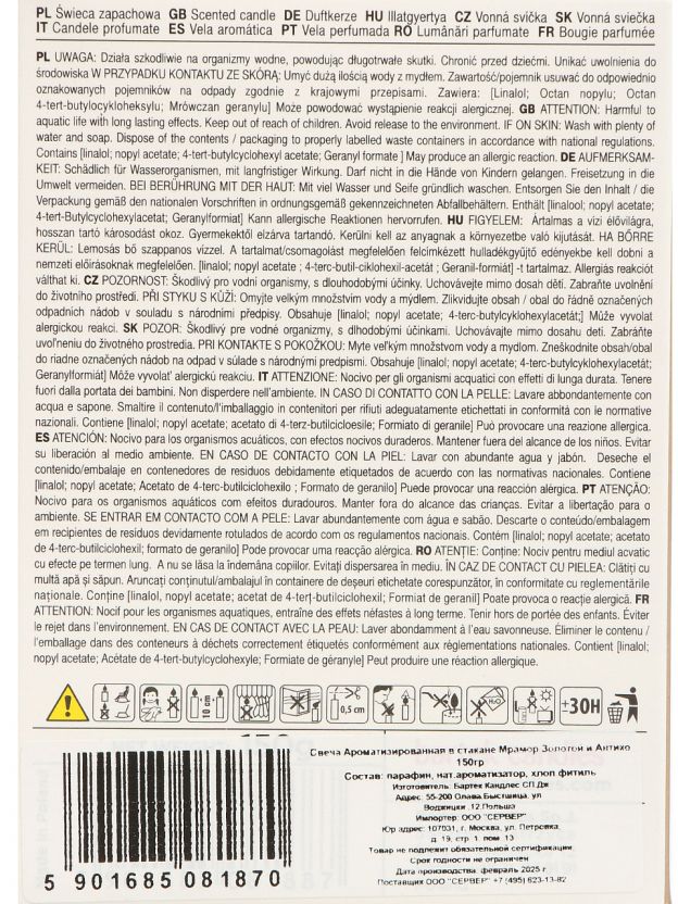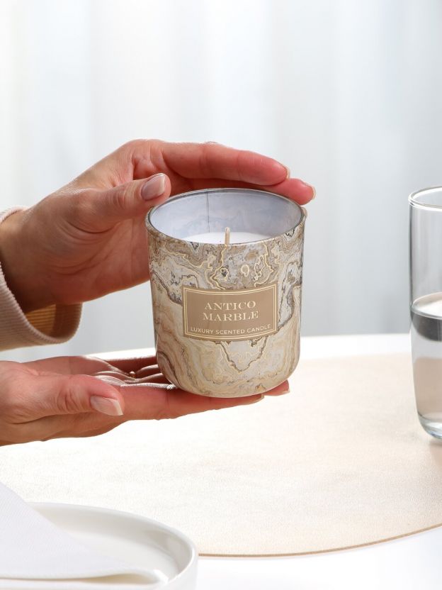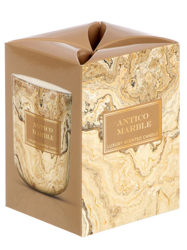 В отличие от стандартных свечей, эта модель идет в стильном стакане, имеет хлопковый фитиль, подарочную упаковку и эксклюзивный дизайн «Мрамор Золотой и Антико».