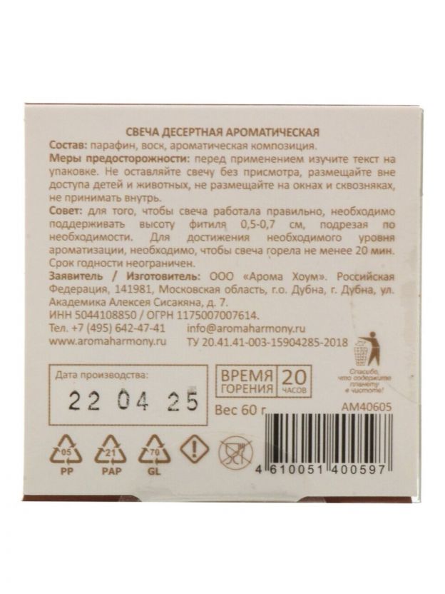 • Экологичный состав: пчелиный, соевый и парафиновый воск, хлопковый фитиль, удобная круглая форма в стакане