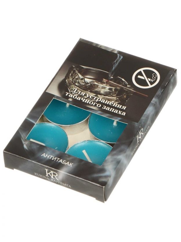 Свечи чайные ароматические Kukina Raffinata Антитабак — 6 голубых свечей по 3,5 часа для эффективного устранения запаха табака дома, на даче или в офисе.