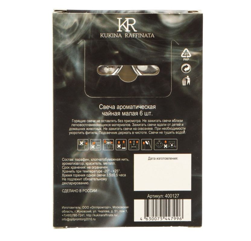 Время горения одной чайной свечи Kukina Raffinata Антитабак — до 3,5 часов благодаря парафиновой основе и хлопковому фитилю.
