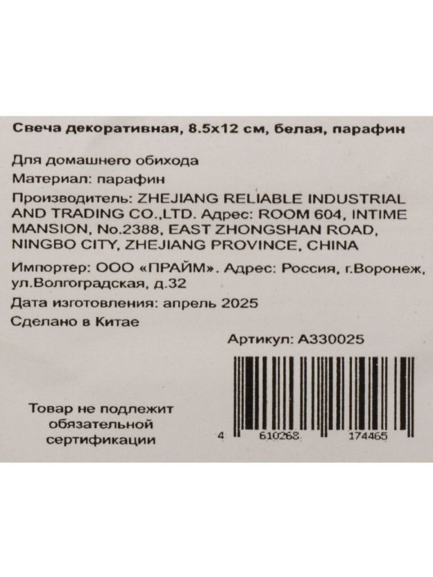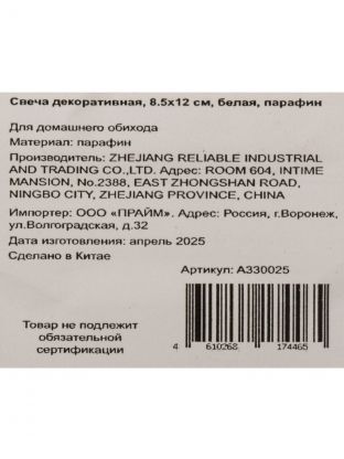 Высота — 12 см, диаметр — 8,5 см, фигурная форма, белый цвет, без подсвечника, одна свеча в упаковке. Производство — Китай, артикул A330025.
