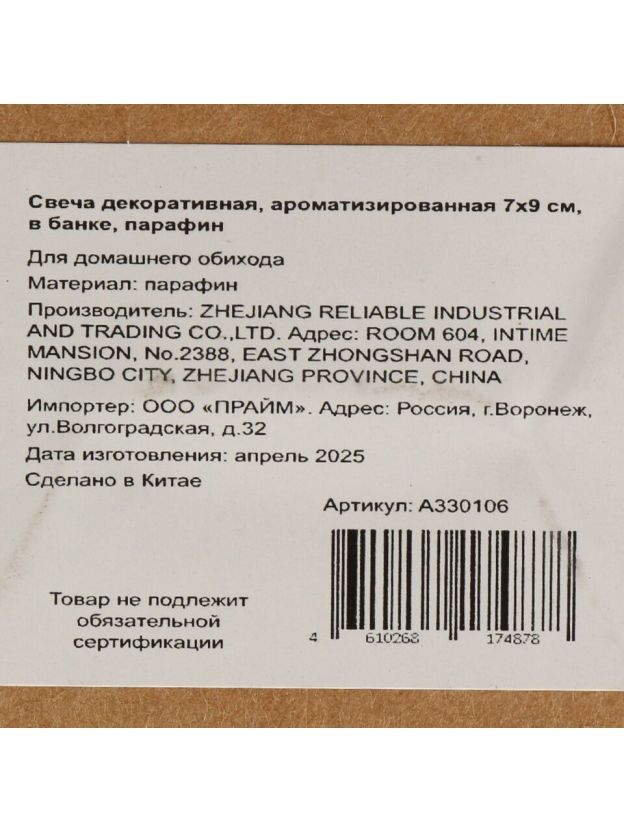 - Парафин высокого качества, хлопковый фитиль, размер 9х7 см — оптимально для длительного горения и равномерного аромата