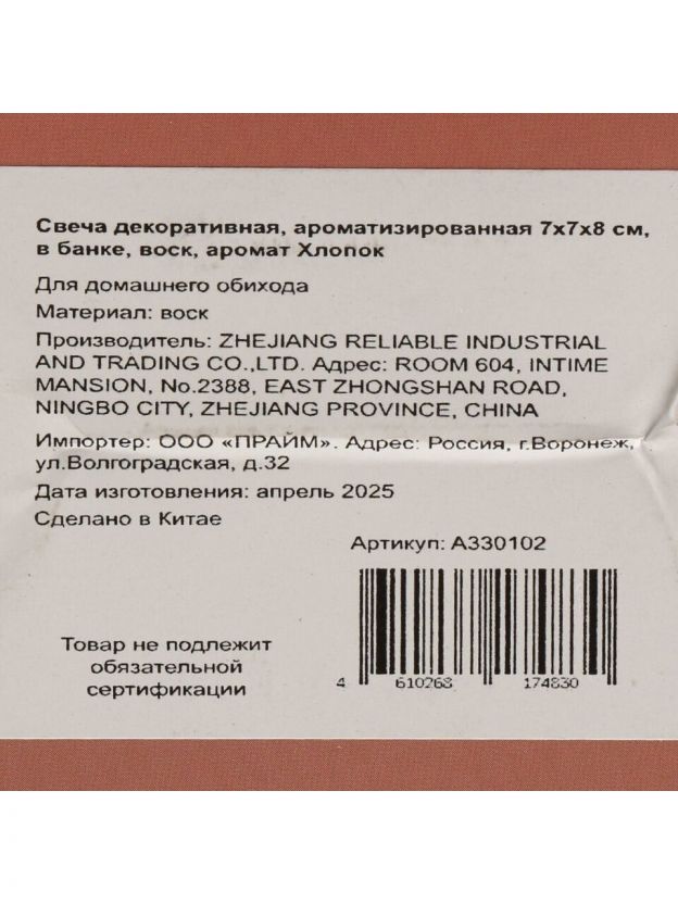 Добавьте свечу с ароматом хлопка в корзину сейчас — получите приятный бонус к заказу и создайте атмосферу уюта уже сегодня. Гарантируем высокое качество и быструю доставку!
