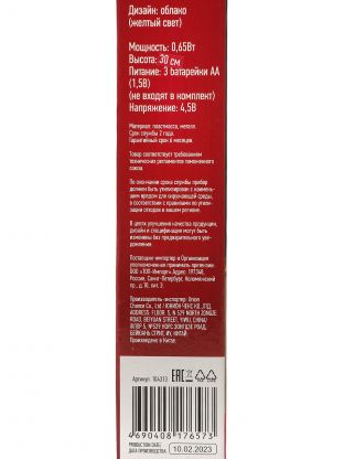 Высота вместе с подставкой — 20 см, материал корпуса — пластик, мощность — 0,65 Вт, напряжение — 4,5 В, цвет свечения — жёлтый. Страна производства — Китай, гарантия производителя — 6 месяцев.