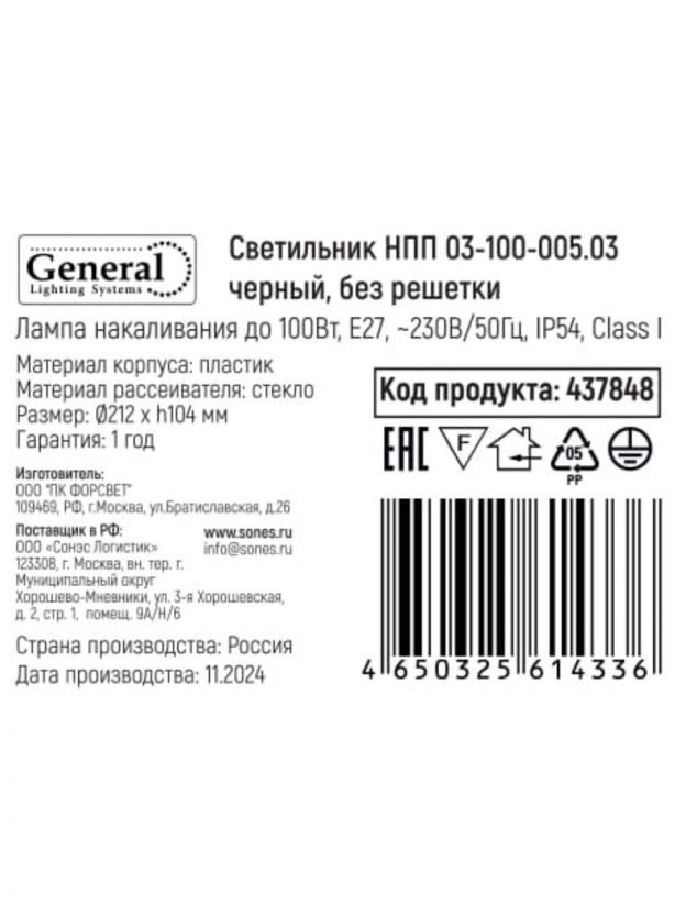 Светильник General НПП 03-100-005.03 черный — оптимальное решение для влажных помещений: IP54, долговечный корпус, универсальный дизайн.