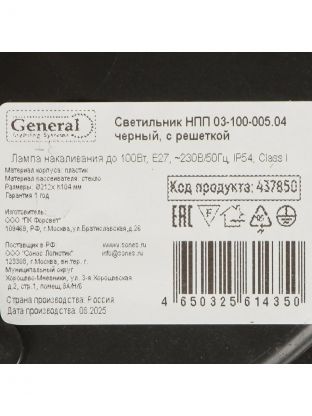 Светильник General НПП 03-100-005.04 черный с решеткой — надежное освещение для дома и дачи: защита IP54, прочное стекло, монтаж за 10 минут.