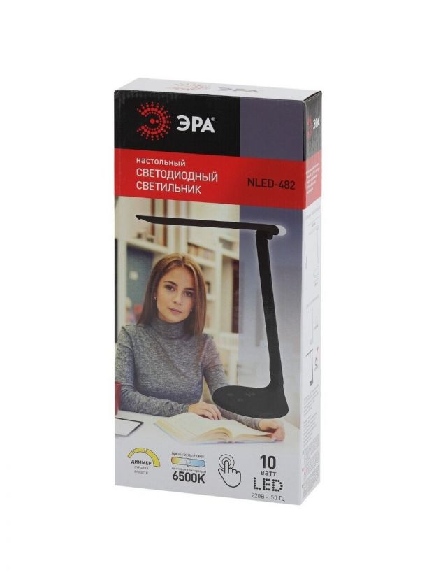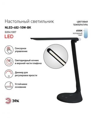Настольный светильник ЭРА NLED-482-10W-BK - удобная складная модель с сенсорным управлением, с тремя уровнями яркости и светодиодным ночником в верхней части плафона. Светит холодным белым светом, который бодрит и повышает работоспособность. Ночник в верхней части плафона имеет отдельный сенсорный выключатель на основании.