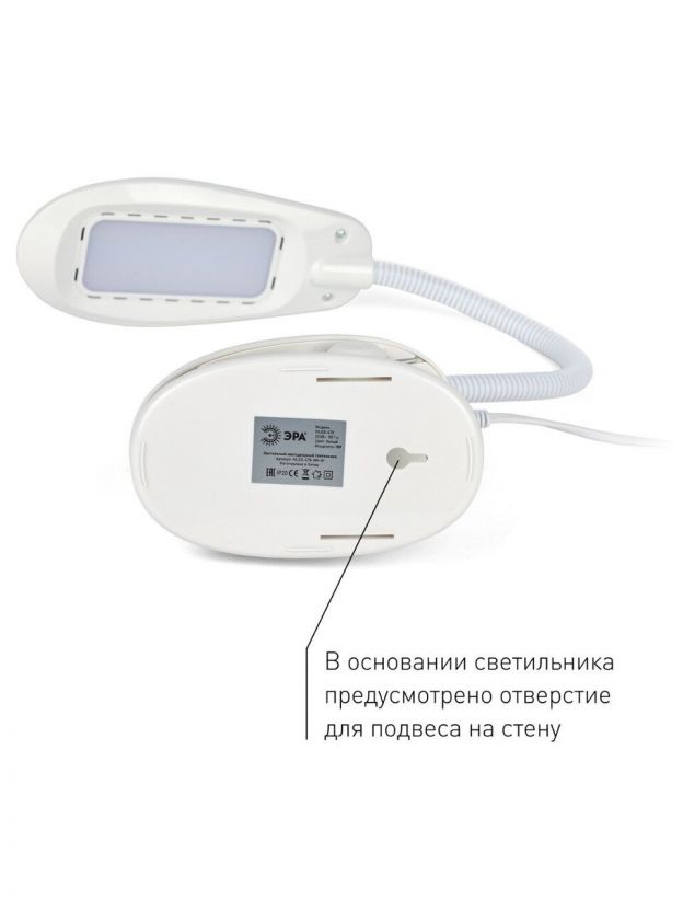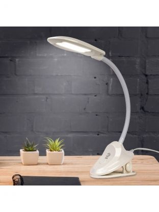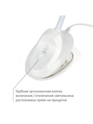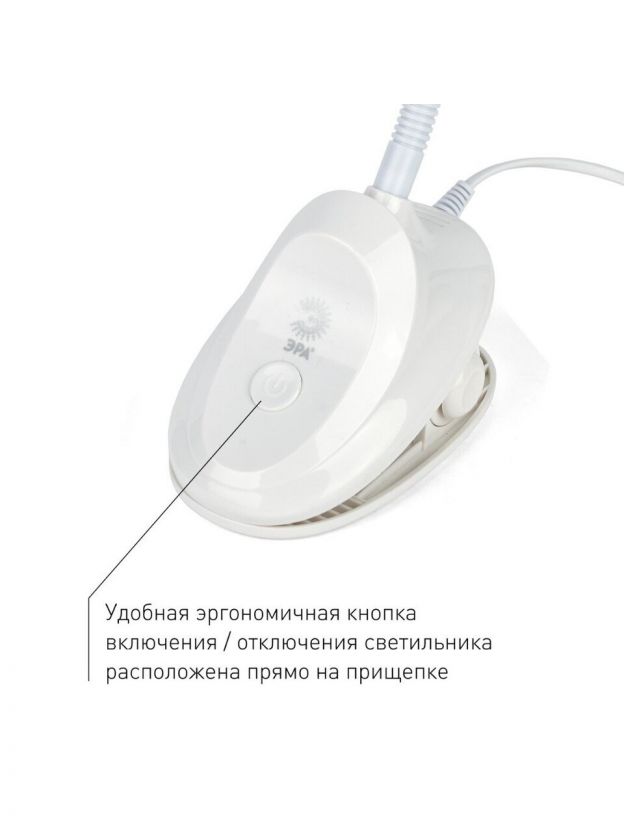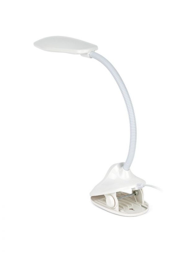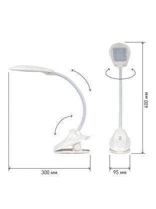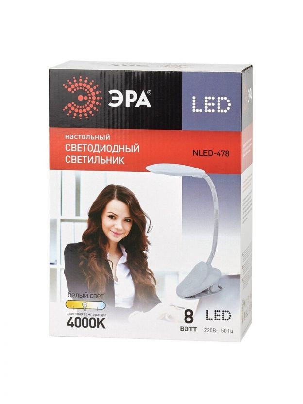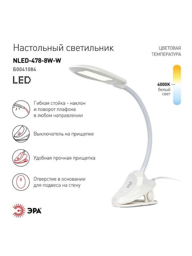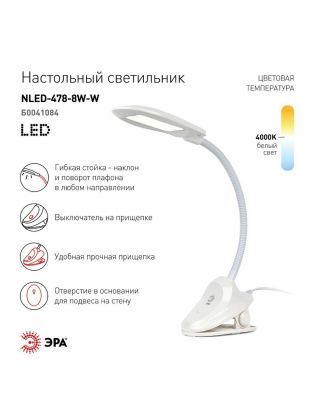 Настольный светильник-прищепка ЭРА NLED-478-8W-W со светодиодами (LED) в качестве источников света. У светильника выключатель на основании. Это базовая модель с оптимальным универсальным дизайном хорошей для работы за столом высоты. Гибкая стойка позволяет выбирать наиболее комфортное направление света.