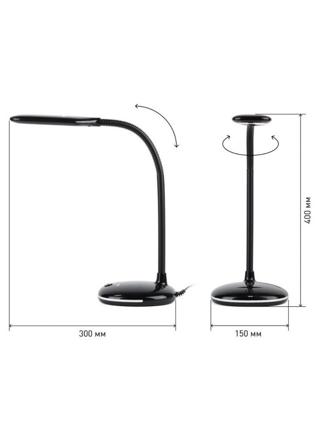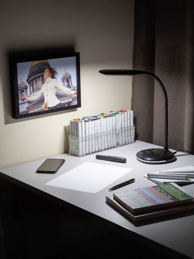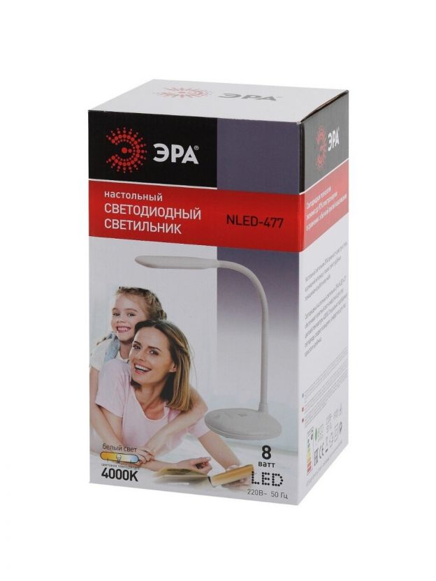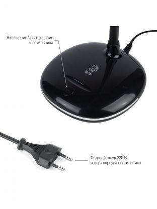 Настольный светильник ЭРА NLED-477-8W-BK со светодиодами (LED) в качестве источников света. У светильника выключатель на основании. Это базовая модель с оптимальным универсальным дизайном хорошей для работы за столом высоты (40 см). Гибкая стойка позволяет выбирать наиболее комфортное направление света.