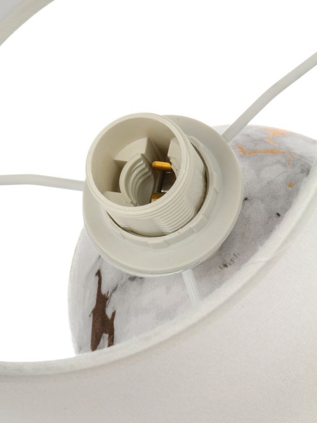 Высота светильника — 25,5 см, основа выполнена из керамики, абажур — из текстиля. Цвет арматуры — белый с золотым, абажур — белый.