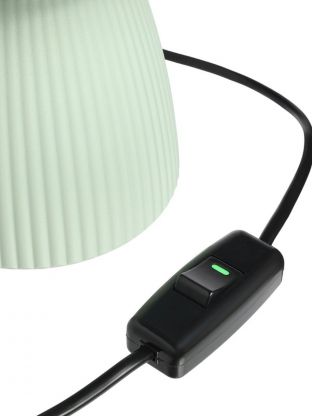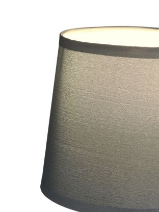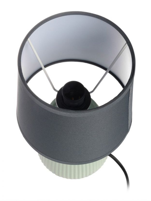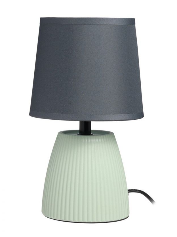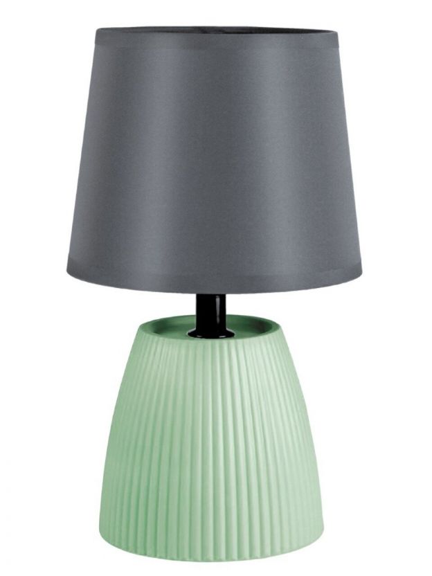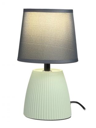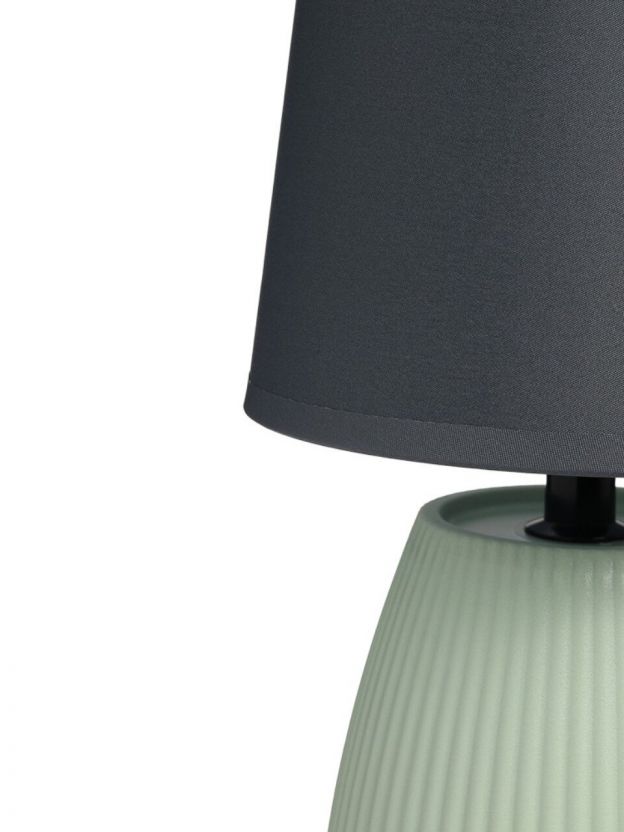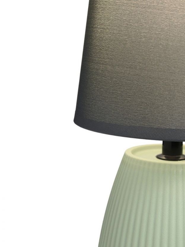 Высота 25 см, арматура из керамики, абажур из текстиля. Цвет основания — зелёный, абажур — серый, стиль — современный.