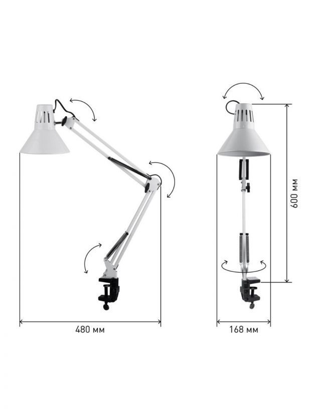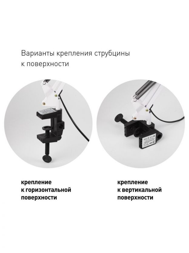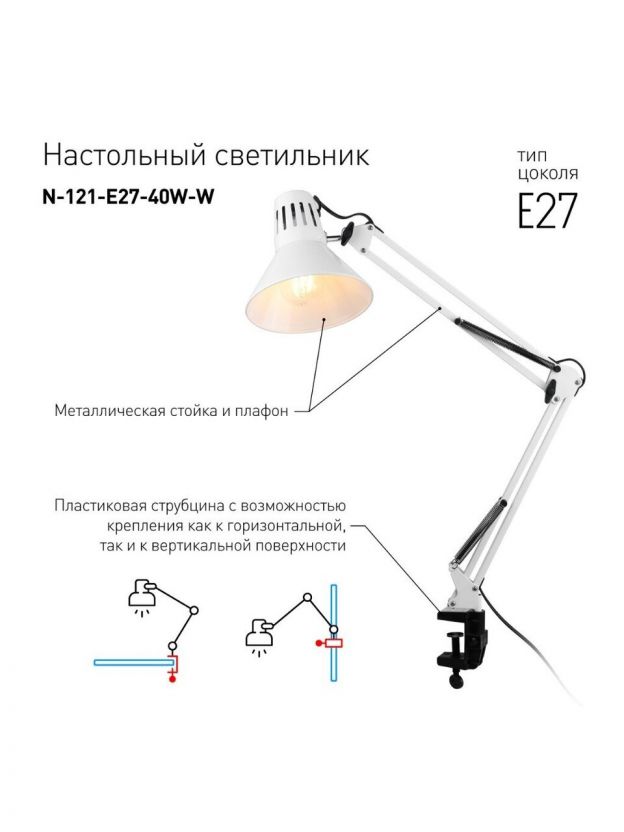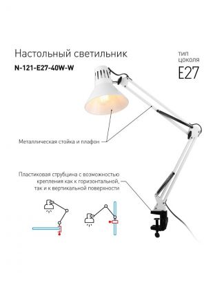 Настольный светильник ЭРА N-121-E27-40W-W классического дизайна может использоваться с разными источниками света - лампой накаливания, компактной люминесцентной лампой (КЛЛ) или светодиодной (LED) лампой. Выключатель на проводе. Крепится на струбцину. Высота плафона регулируется двухсекционной сгибающейся стойкой, направление света - поворотом и наклоном плафона в любом направлении.
