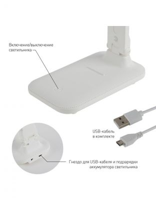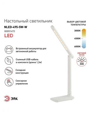 Светильник настольный аккумуляторный, складной, 5 Вт, с USB, белый, Эра, NLED-495-5W-W, Б0051472