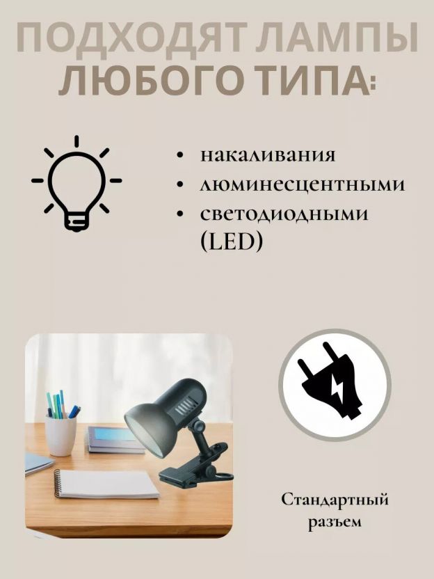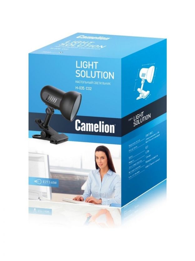 Светильник настольный на прищепке, E27, 40 Вт, черный, абажур черный, Camelion, H-035 С02, 7197