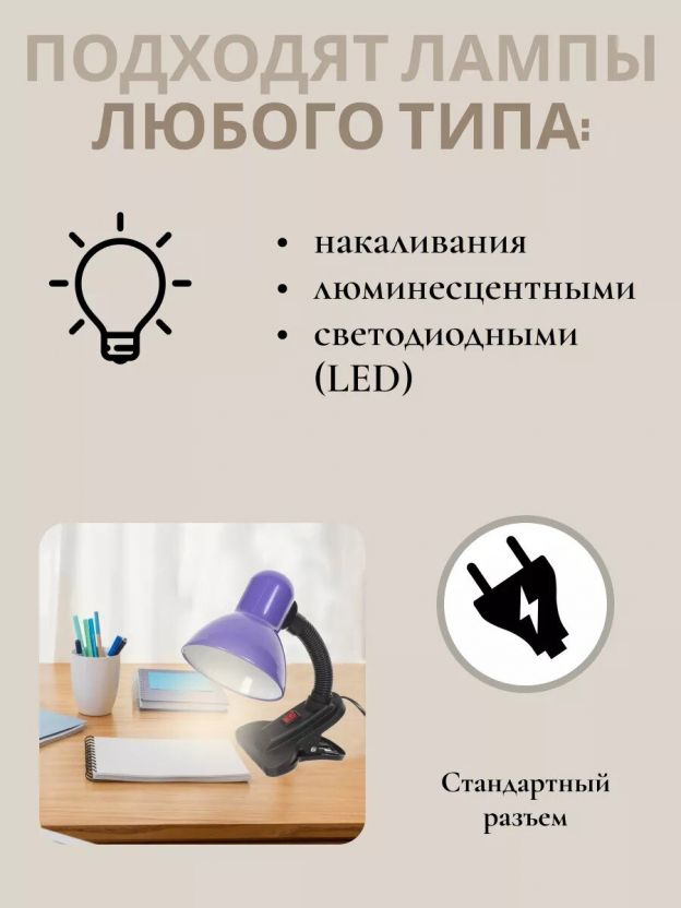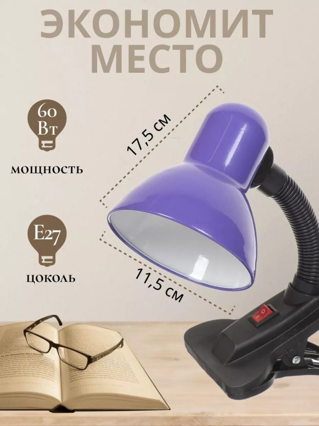 Настольный светильник с прищепкой - современная по стилю исполнения, экономичная в энергопотреблении, надежная, долговечная и безопасная в эксплуатации модель. Удобная подставка-прищепка поможет надёжно закрепить прибор на краю стола, в изголовье кровати или любом другом нужном месте. Благодаря гибкой ножке, лампу можно согнуть под любым углом и направить поток света в необходимую сторону. Запаса яркости будет вполне достаточно для чтения, письма, работы за компьютером
