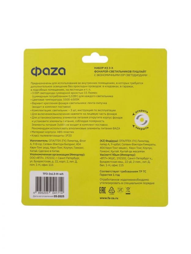 Светильник светодиодный, ФАZА, TF3-3xL3-H-wh, 6500 К, 15 Лм, IP20, 7.5х7.5х2 см, пушлайт, 5041714
