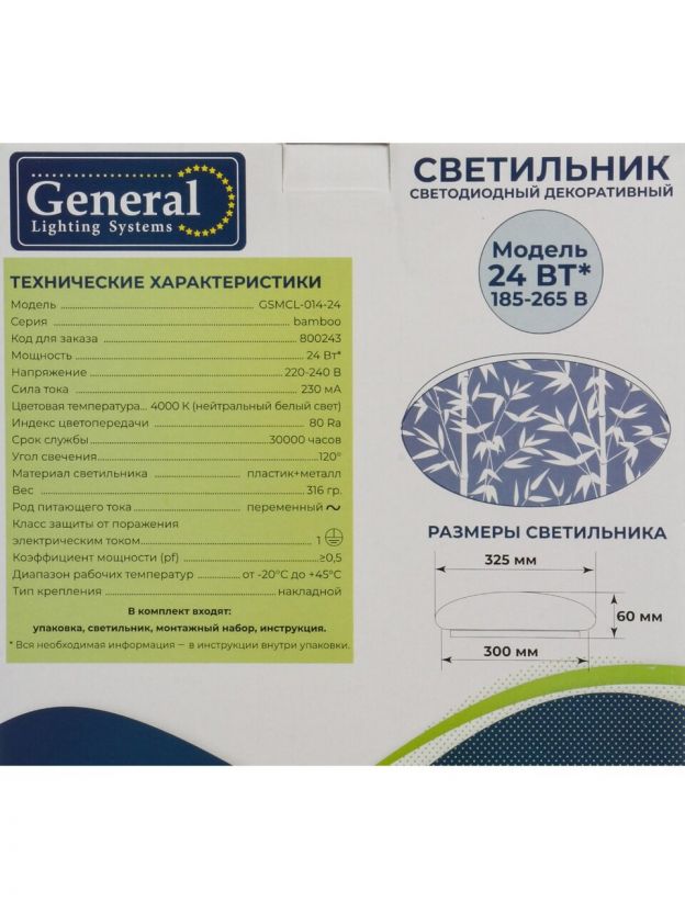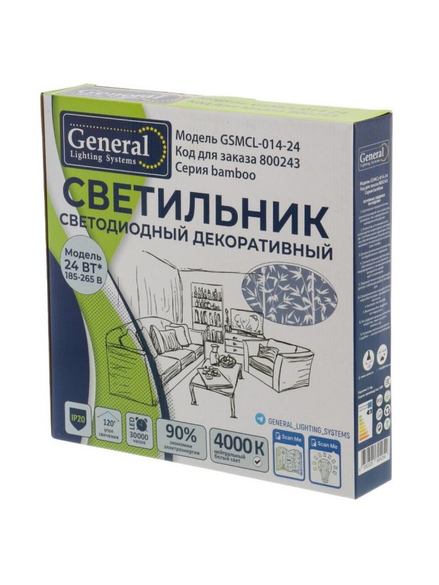 Светильник светодиодный, General Lighting Systems, GSMCL-014-24 Bamboo, 24 Вт, 4000 К, 1560 Лм, IP20, 32.5х30х6 см, нейтральный белый свет