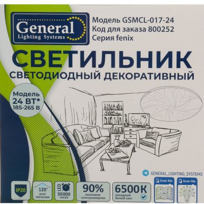 Ищете, какой потолочный светодиодный светильник выбрать для дома или офиса? General GSMCL-017-24 Fenix — оптимальное решение для тех, кто ценит яркий, равномерный свет и простоту монтажа. Холодный белый свет 6500 К отлично подходит для рабочих зон, кухни, коридора или прихожей, обеспечивая максимальную видимость и комфорт для глаз. Благодаря встроенным светодиодам вы экономите на электроэнергии и забываете о частой замене ламп.