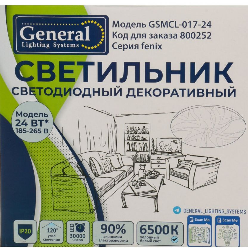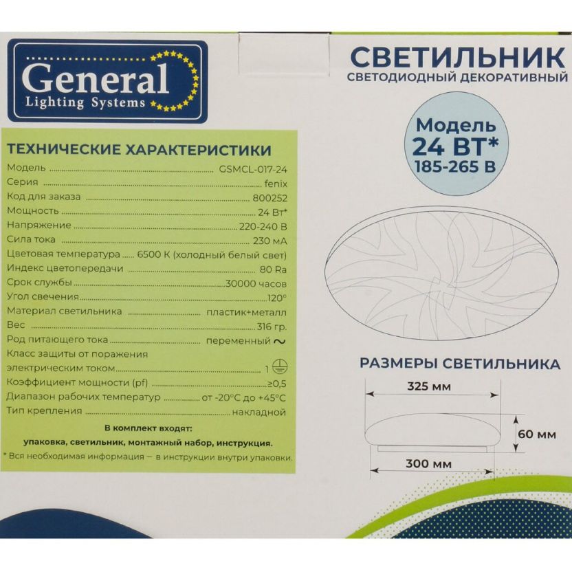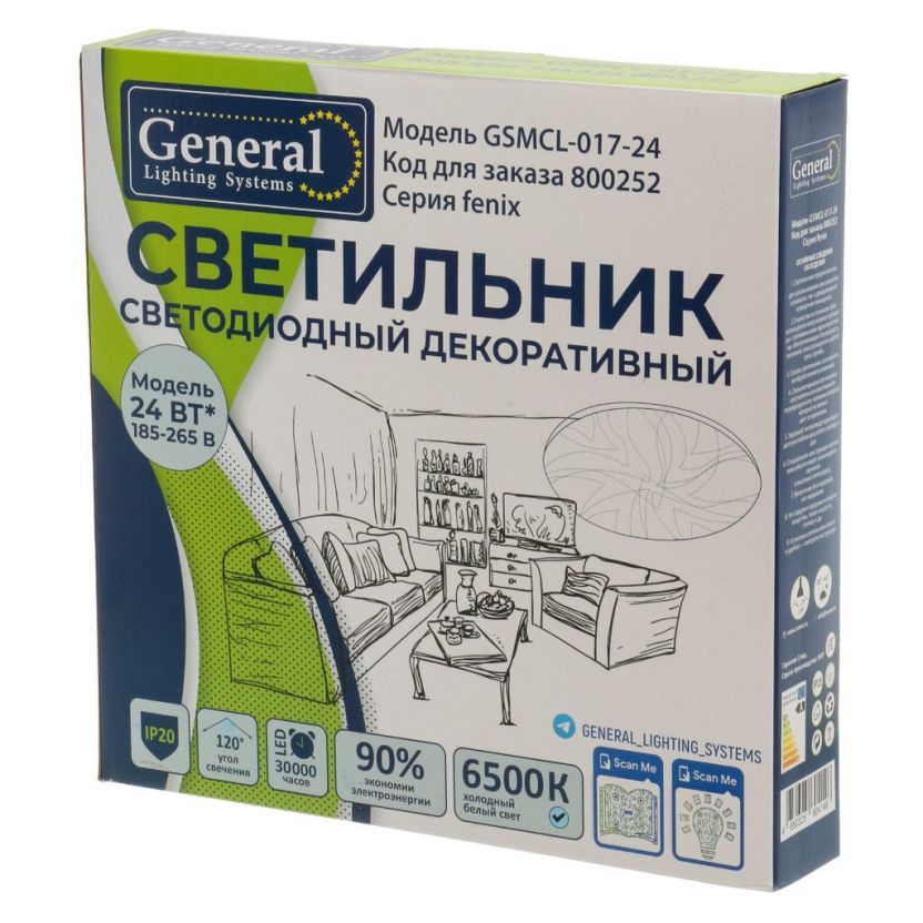 Светильник светодиодный, General Lighting Systems, GSMCL-017-24 Fenix, 24 Вт, 6500 К, 1560 Лм, IP20, 32.5х30х6 см, холодный белый свет