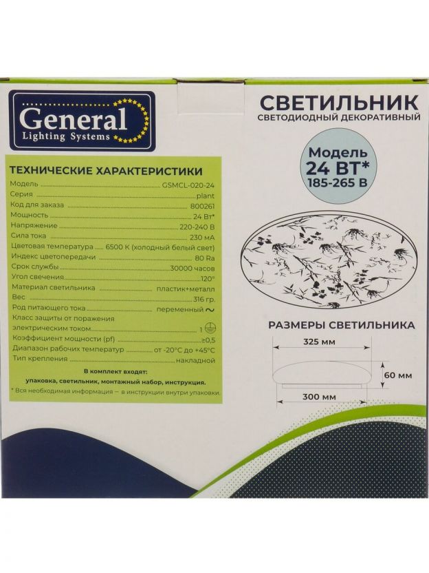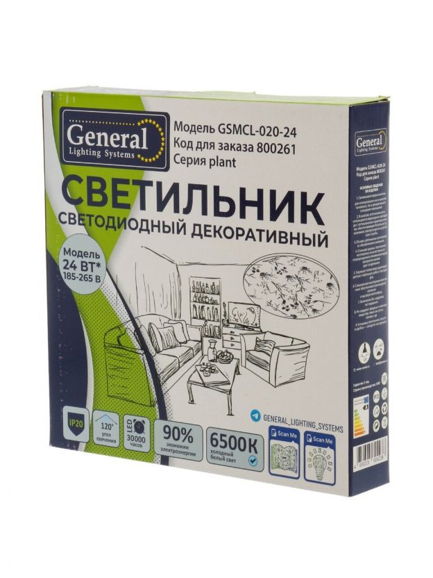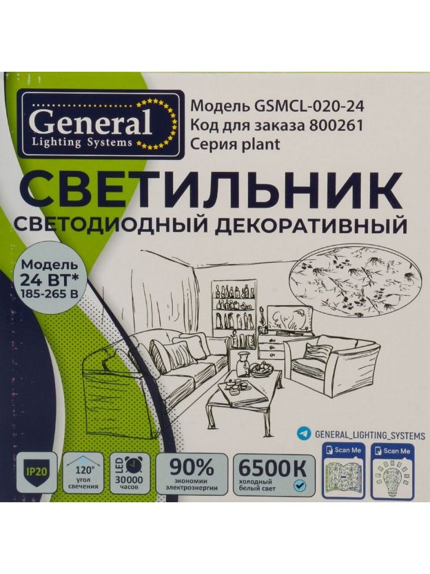 Светильник светодиодный, General Lighting Systems, GSMCL-020-24 Plant, 24 Вт, 6500 К, 1560 Лм, IP20, 32.5х30х6 см, холодный белый свет