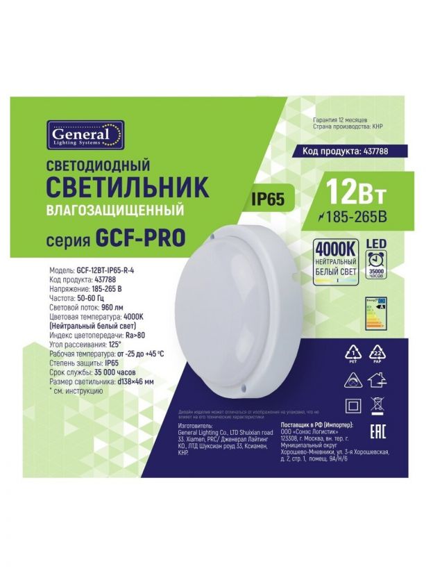 Модель ЖКХ GE 12 Вт с классом защиты IP65 устойчива к влаге и пыли, подходит для установки в подъездах, коридорах, на улице и в производственных помещениях.
