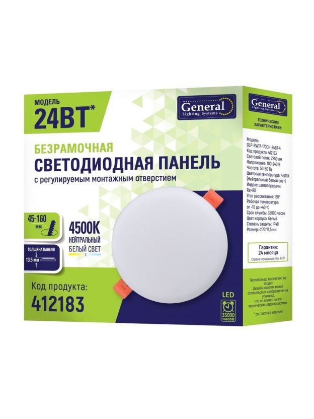 Светильник светодиодный RW17-170CH, 24 Вт, 4500 К, круглый, IP40, с регулируемым креплением, 45-160 мм, General Lighting Systems, 412183