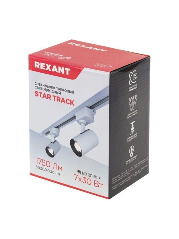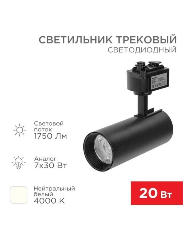 Светильник трековый светодиодный, Rexant, Стар Трек, 20 Вт, 4000 К, 1750 Лм, IP20, 30 град, LED, черный, 611-006