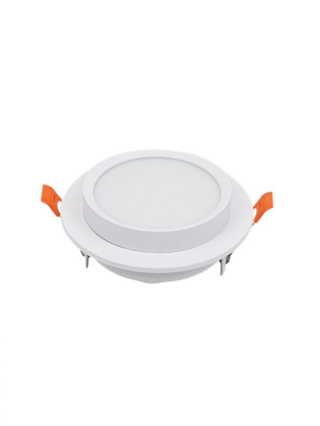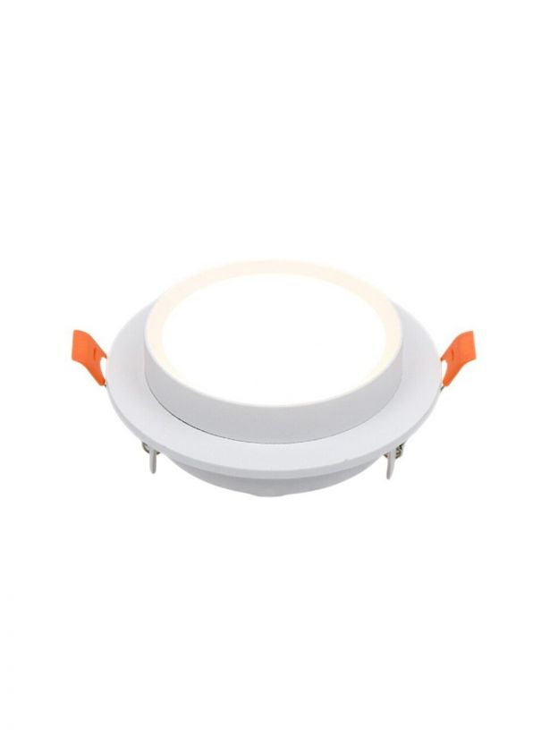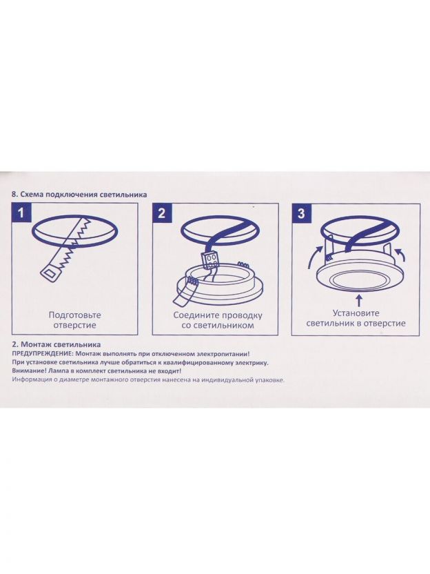 Для монтажа требуется отверстие диаметром 90 мм, высота светильника — всего 5 см, что позволяет устанавливать его даже в низких потолках.