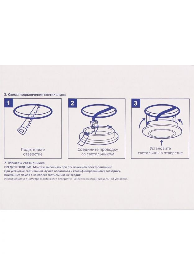 Для установки требуется отверстие диаметром 90 мм. Высота светильника — 7 см, что позволяет использовать его даже в компактных потолочных нишах.