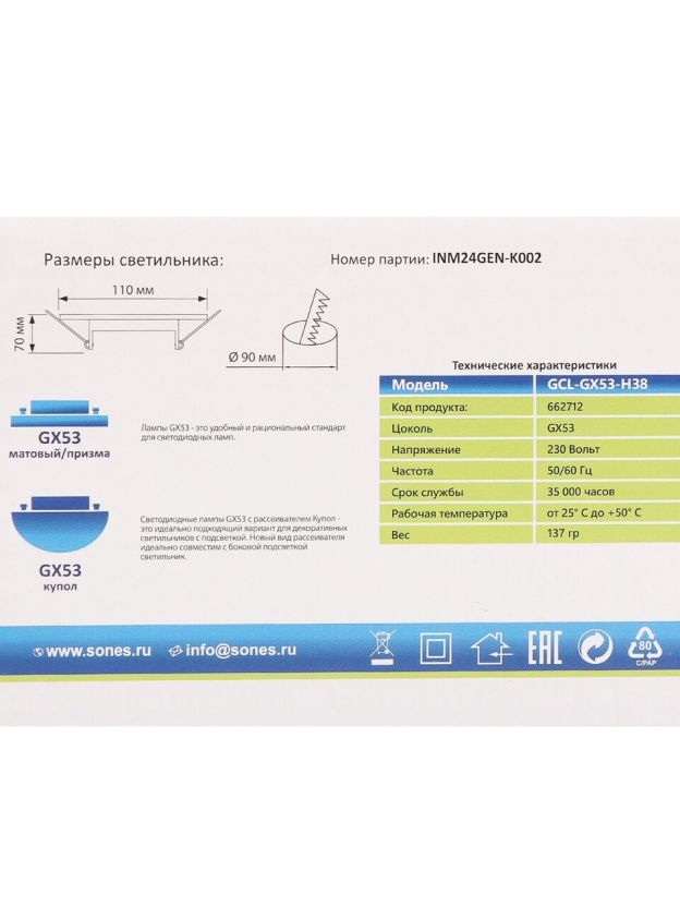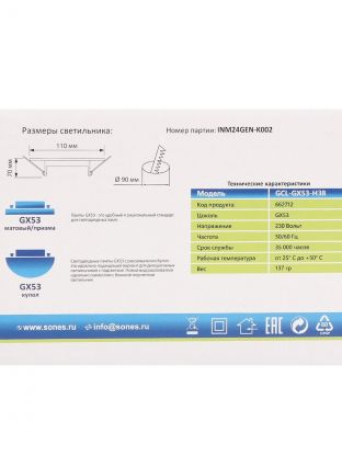 Светильник оснащён стандартным цоколем GX53 и работает от сети 230 В. Это удобно для большинства современных электросетей.