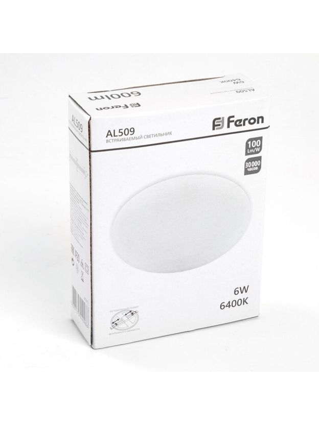 Светильник встраиваемый светодиодный, Feron, AL509, 6 Вт, 6400 К, 600 Лм, IP20, 8.5х8.5х2 см, дневной свет, 41211