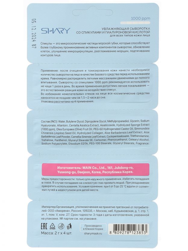 Сыворотка для лица, Shary, увлажнение, со спикулами и гиалуроновым комплексом, 8 г