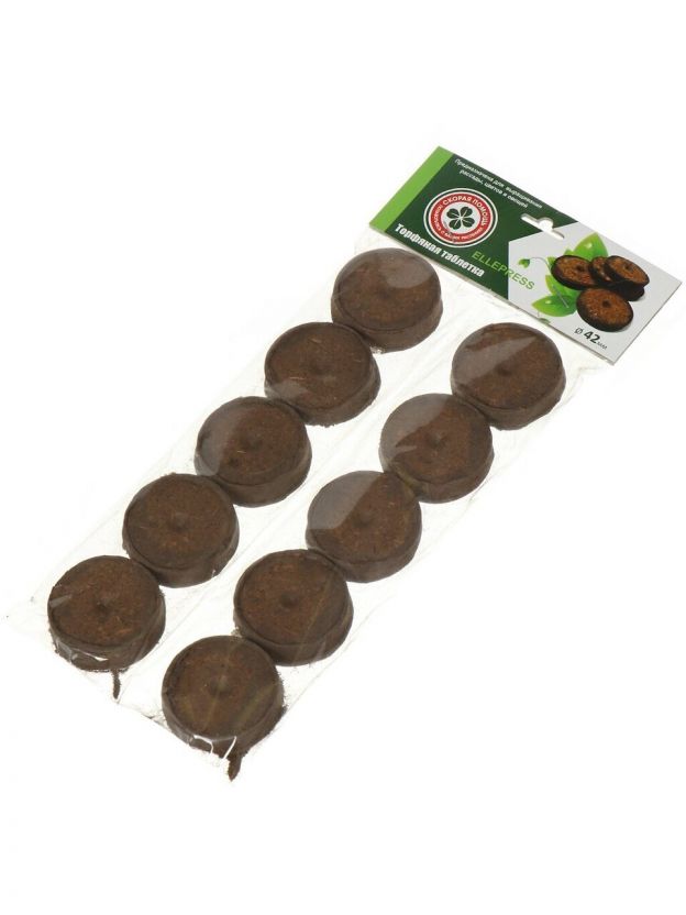 В упаковке 8 штук диаметром 42 мм, изготовлены из прессованного натурального торфа, без искусственных добавок, подходят для органического земледелия.