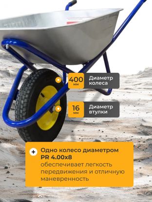 Тачка оснащена одним пневматическим колесом диаметром 400 мм, что обеспечивает отличную маневренность и легкость передвижения даже по неровным поверхностям. Диаметр втулки составляет 16 мм, что гарантирует дополнительную устойчивость и долговечность конструкции. Легкий вес в 10.7 кг делает ее удобной для транспортировки и хранения.