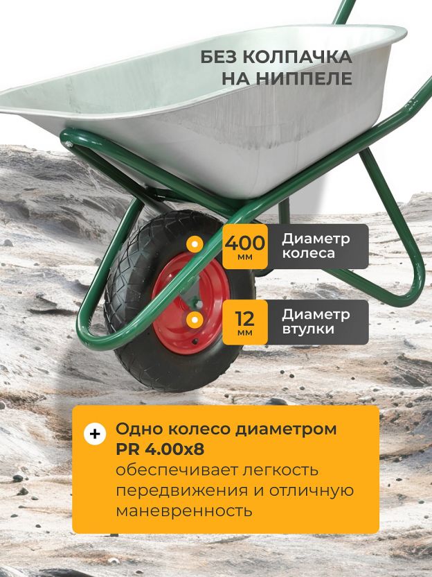 Тачка строительная одноколесная, сталь, 200кг, 110 л, без колпачка на ниппеле, 0.8 мм, втулка D12 мм, PR4.00х8, Профи