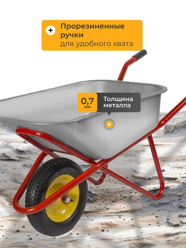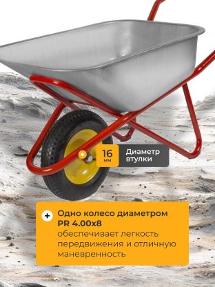 - вместительность: объем 110 литров позволяет легко транспортировать как сыпучие, так и крупногабаритные материалы;