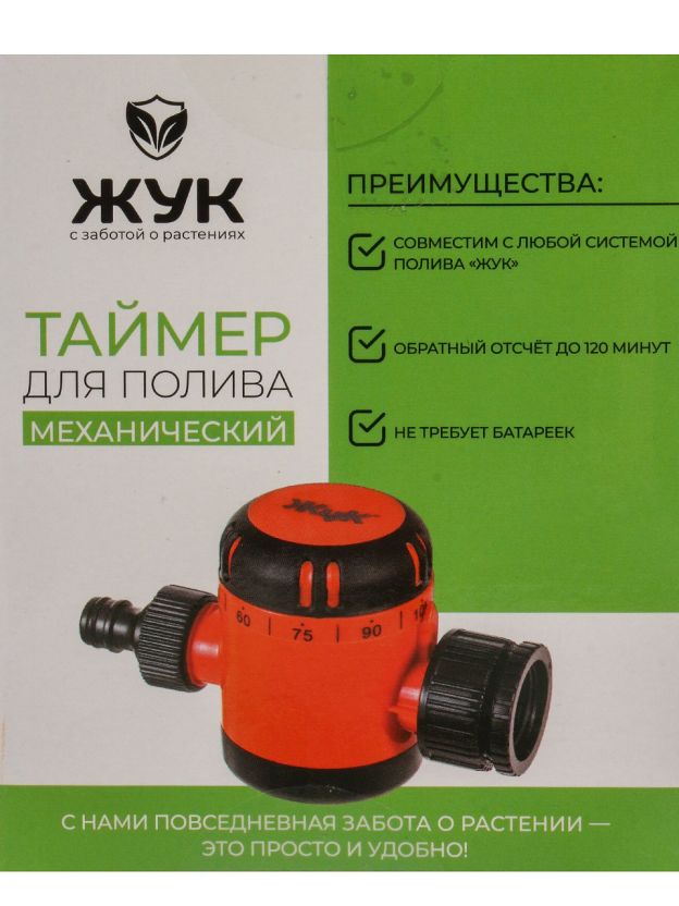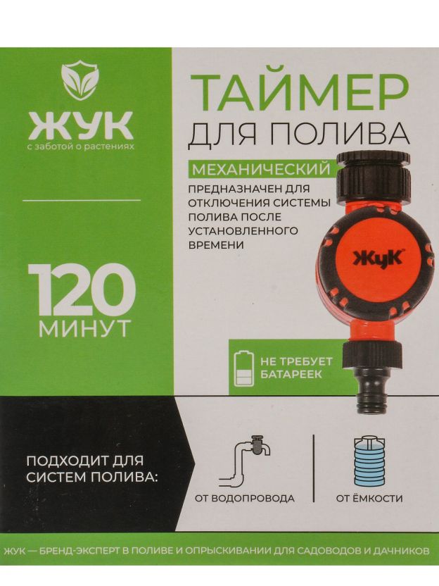 Механический таймер, обратный отсчет до 120 минут, корпус устойчив к влаге, не требует батареек, совместим с большинством систем полива. Производитель — Россия, бренд Жук.
