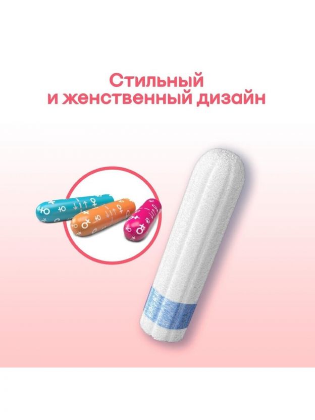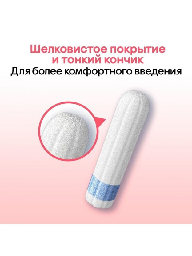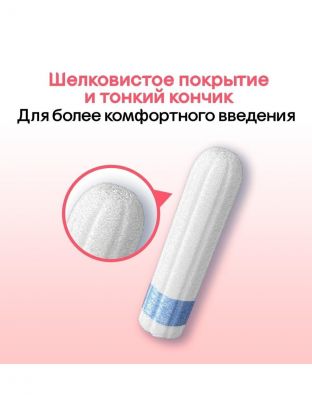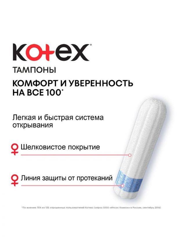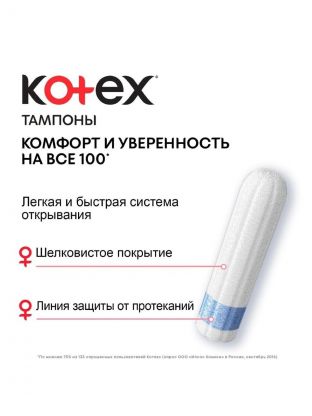 Тампоны Kotex гарантируют максимально комфортное введение благодаря поверхности Silky Cover. Уникальная система «Поверни-и-Открой» для удобного использования. Специальная голубая зона, состоящая из гидрофильных волокон Ultra Sorb, быстро проводит влагу, удерживает ее внутри и обеспечивает надежную защиту от протеканий.
