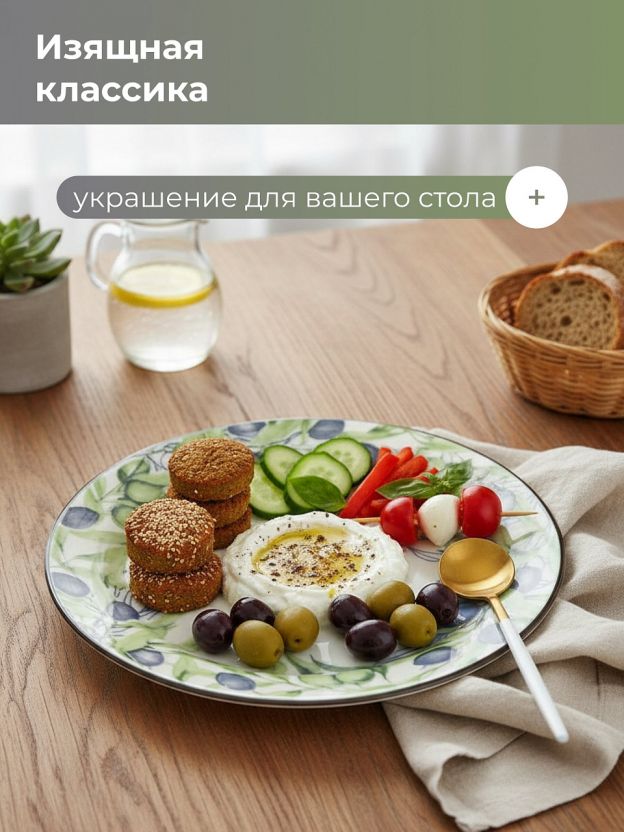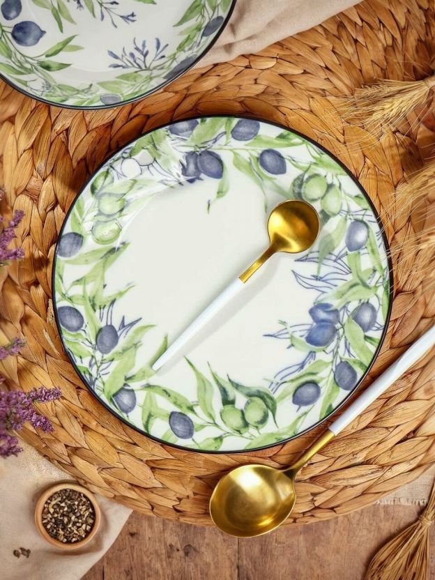 Фарфор прочнее, дольше сохраняет тепло, не впитывает запахи и выглядит более элегантно. Тарелка «Оливки» сочетает практичность и стиль, подходит для ежедневного и праздничного использования.