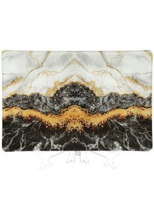 Размер — 20х30 см, форма — прямоугольная, цвет — серый с эффектом мрамора; подходит для сервировки, подачи десертов, закусок и украшения стола.