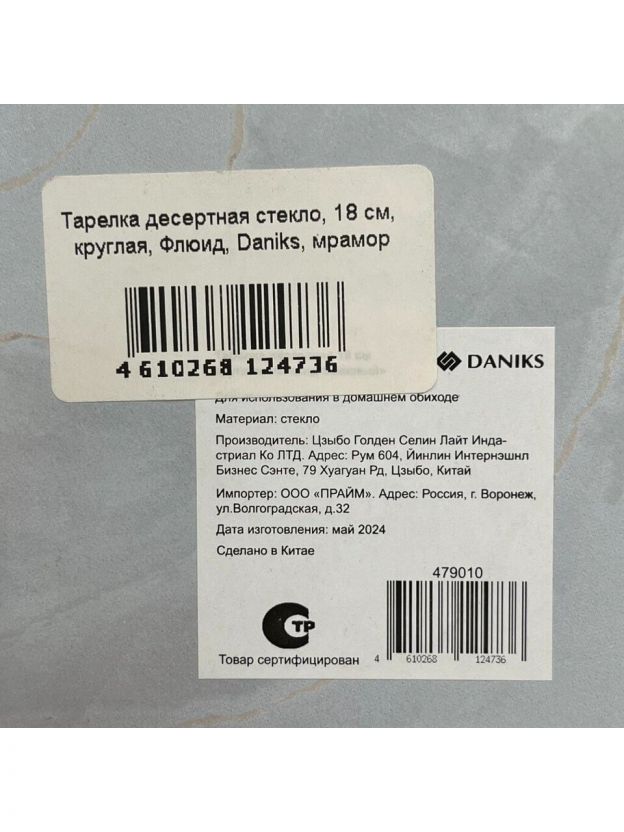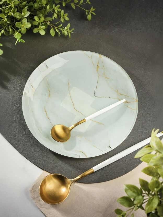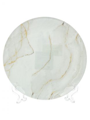 Диаметр тарелки — 18 см, материал — безопасное закалённое стекло с декоративным рисунком под мрамор.