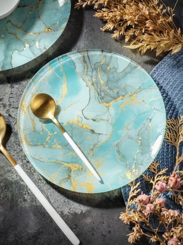 - Эксклюзивный дизайн «под мрамор» в бирюзовом цвете — современный акцент на любом столе