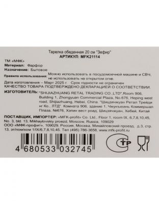 Тарелка обеденная фарфоровая 20 см MFK Зефир — стильное решение для сервировки и ежедневного использования: прочный материал, лаконичный дизайн, оптимальный размер для любого блюда.