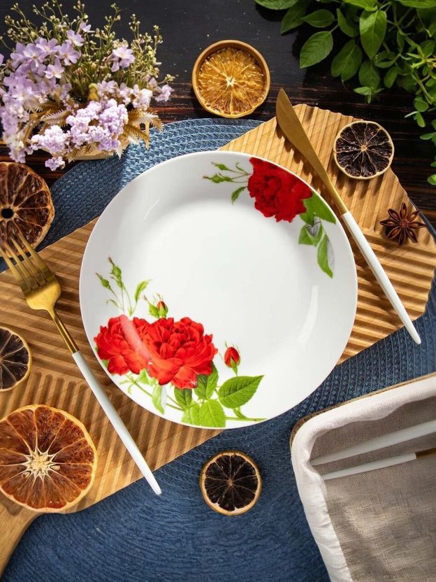 В отличие от пластиковых и стеклянных моделей, керамика Daniks долговечнее, лучше сохраняет температуру блюд и имеет уникальный принт «Алая роза».