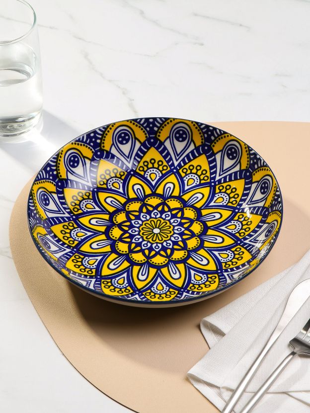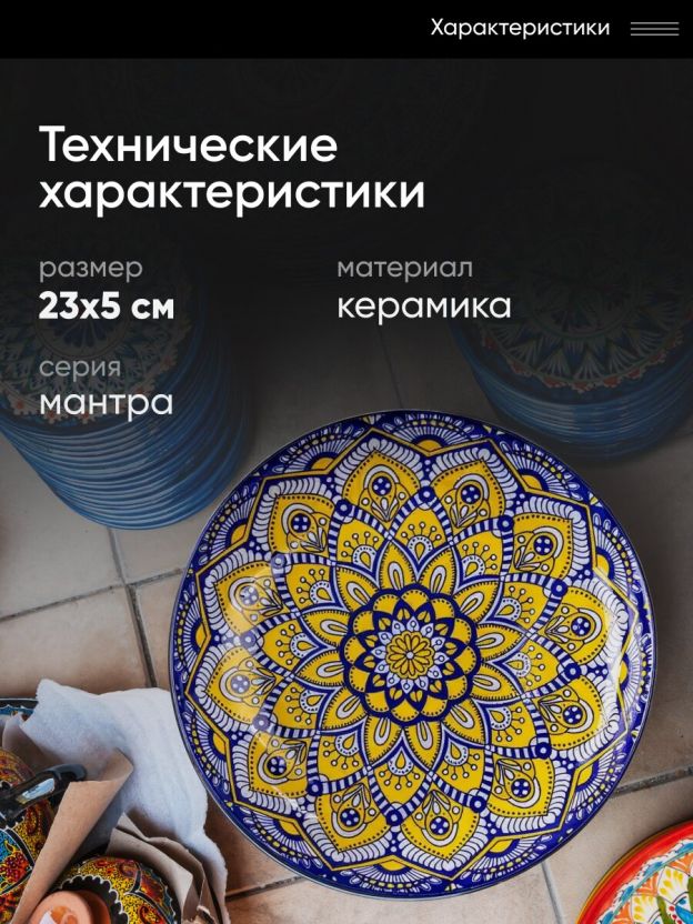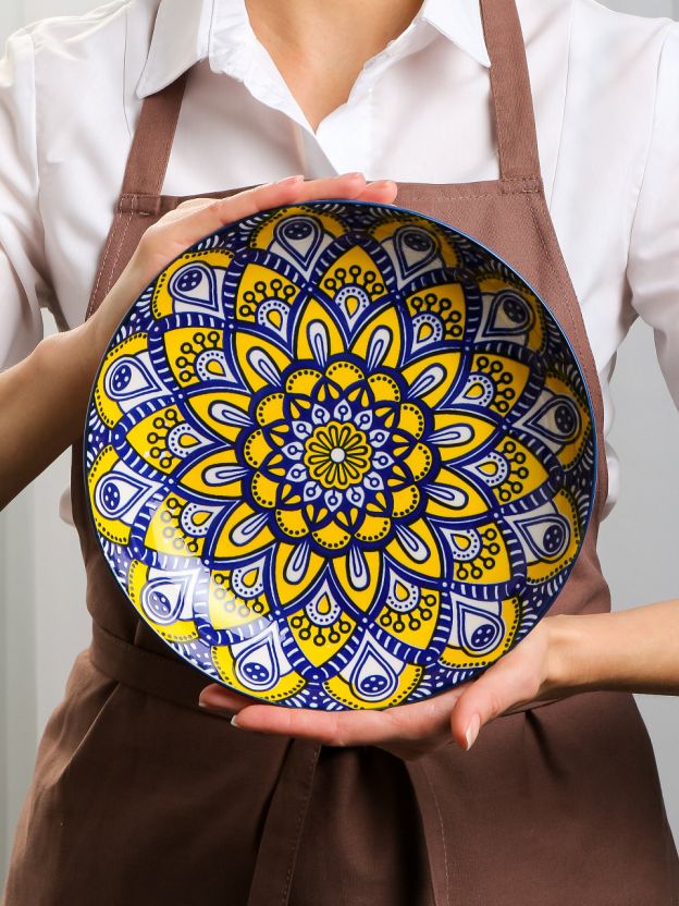 Обеденная керамическая тарелка Мантра диаметром 23 см — это сочетание эстетики восточного орнамента и функциональности. Благодаря прочной керамике, изделие выдерживает ежедневное использование, сохраняя насыщенный синий цвет и рисунок. Для тех, кто ищет, какую тарелку выбрать для сервировки или как выбрать керамическую посуду для дачи, модель Y6-6016 станет оптимальным решением: ее удобно использовать для горячих и холодных блюд, а также разогревать пищу в СВЧ.